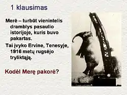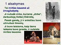Each question, as is shown on the screen, consists of two slides, one for question and one for answer. The question slide usually includes introduction that is meant both to help find out the answer to the question and to describe the subject more, and the question itself. The answer slide includes a detailed explanation of the answer. The goal of Protmušis is not only to entertain but to expand the knowledge of the players and the spectators as well, therefore, the questions that are related to interesting subjects that are not widely known to the general public, but are worth to be known, are especially valued. Both the question slide and the answer slide are usually illustrated with pictures related to the subject.