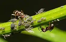 A further example of protocooperation is the connection between ants and aphids. The ant searches for food on trees and shrubs that are hosts to honeydew-secreting species such as aphids, mealybugs, and some scales. The ant gathers the sugary substance and takes it to its nest as food for its offspring. It has been known for the ant to stimulate the aphid to secrete honeydew straight into its mouth. Some ant species even look after the honeydew producers from natural predators. In areas where the ant inhabits the same ecosystem as the aphid, the plants they inhabit normally suffer from a higher presence of aphids which is detrimental to the plant but not to the two species protocooperating.