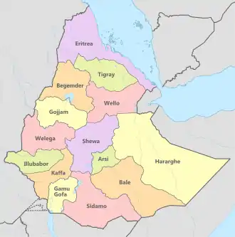 Ethiopia was divided into 12 provinces or governates-general (taklai ghizat) by Imperial Ethiopian Government Decree No. 1 of 1942 and later amendments.[3] The 12 provinces were: