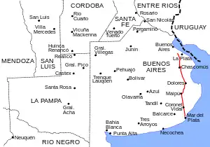 The stretch from Buenos Aires to Chascomús was modified in order to the road passes by lands nearer to the city of La Plata. The new road only had three railroad crossings with General Roca Railway tracks: one at the South of Chascomús (km 128), the other at the South of Dolores (km 208,5) and the last inside the urban zone of Mar del Plata (km 403,5). Besides, an iron bridge was built in the Bosques district and an embankment was conceived in order to the railroad tracks passed over the route in Sarandí. This project was repeatedly delayed until it was finally opened by President Juan Domingo Perón in 1953.[21] There was also a level crossing in Berazategui Partido, three else in La Plata Partido, another in General Guido and the last in Vivoratá.[22] All those crossing would be later deactivated as branch-lines were closed in the 1960s and 1970s. The line between General Guido and Pinamar was reactivated in December 1996,[23] although it was suspended in April, 2011.[24] The service was reestablished in January 2021.[25]