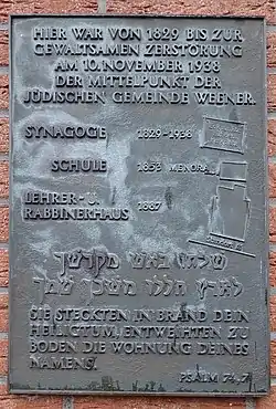 ![]() "Gedenktafel Synagoge Weener" in der Westerstraße 32; with citation from Psalm 74:7: "They have set Thy sanctuary on fire; they have profaned the dwelling-place of Thy name even to the ground." | |