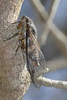 A 1995 paper found that the black prince and related redeye are favoured food items of the noisy friarbird, which swallows them head-first and whole. The width of its gape size is similar to that of the two cicada species. Red wattlebirds have been found to ignore the cicadas, possibly because their gapes are not wide enough to accommodate swallowing them whole.[13] Noisy miners, blue-faced honeyeaters, little wattlebirds, grey and pied butcherbirds, magpie-larks, Torresian crows, white-faced herons and even the nocturnal tawny frogmouth, have all been reported as significant predators.[12] The frogmouths and bearded dragons have been observed feeding on emerging nymphs, however total nymphal mortality is estimated at under 10%.[12] The black prince is also preyed upon by the cicada killer wasp (Exeirus lateritius), which stings and paralyses the cicada before storing it in its burrow with the wasp egg, and larva which awakes and consumes the hapless insect.[14]