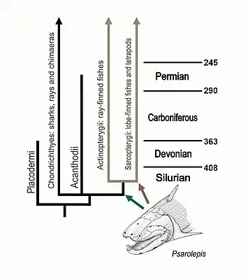 Psarolepis (/sæˈrɒlɪpɪs/; psārolepis, from Greek ψαρός 'speckled' and λεπίς 'scale') is a genus of extinct bony fish which lived around 397 to 418 million years ago (Pridoli to Lochkovian stages). Fossils of Psarolepis have been found mainly in South China and described by paleontologist Xiaobo Yu in 1998. It is not known certainly in which group Psarolepis belongs, but paleontologists agree that it probably is a basal genus and seems to be close to the common ancestor of lobe-finned and ray-finned fishes.[1] In 2001, paleontologist John A. Long compared Psarolepis with onychodontiform fishes and refer to their relationships.