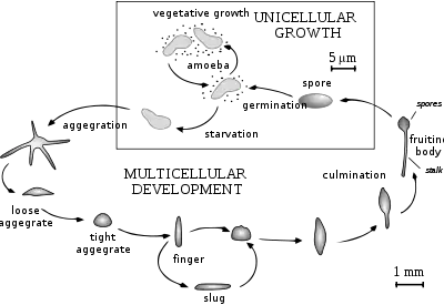 According to species and circumstances, details of the shape of the grex and how it may form will vary but typically the stressed amoebae first produce pheromones that stimulate the flock to vertically assemble in a column. When the column of aggregated cells becomes too high and narrow to stay upright, it topples and becomes a slug-shaped mass: the grex. The grex is mobile; in its form as a slug-like unit it can glide over a moist surface. Once it has moved far enough to complete its development, the cells of the amoebae differentiate according to their positions in the grex; some become the spore cells and the covering shell of the fruiting body near the tip, and others form structures such as the stalk. Cells forming the structural items, such as the stalk and shell, desiccate and die; only the spores in the fruiting body survive to propagate. When circumstances are right and the fruiting body is mature, its shell ruptures and releases the spores. The spores then may be transported by media such as wind or water; they then may cover distances far greater than any that they could have achieved in their amoeboid form, and over regions where amoebae could not travel at all, such as dry surfaces.