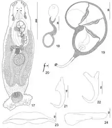 Pseudorhabdosynochus justinella is a small monogenean. The species has the general characteristics of other species of Pseudorhabdosynochus, with a flat body and a posterior haptor, which is the organ by which the monogenean attaches itself to the gill of is host. The haptor bears two squamodiscs, one ventral and one dorsal. The sclerotized male copulatory organ, or "quadriloculate organ", has the shape of a bean with four internal chambers, as in other species of Pseudorhabdosynochus.[2] The vagina includes a sclerotized part, which is a complex structure.