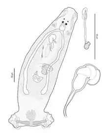Pseudorhabdosynochus maaensis is a small monogenean, 0.5 mm in length. The species has the general characteristics of other species of Pseudorhabdosynochus, with a flat body and a posterior haptor, which is the organ by which the monogenean attaches itself to the gill of is host. The haptor bears two squamodiscs, one ventral and one dorsal. The sclerotized male copulatory organ, or "quadriloculate organ", has the shape of a bean with four internal chambers, as in other species of Pseudorhabdosynochus.[2] The vagina includes a sclerotized part, which is a complex structure. In this species, the sclerotised vagina includes a thin primary canal and a distal heavily sclerotised part including primary chamber and secondary chamber.