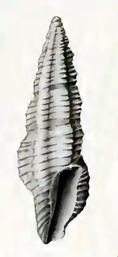 The slender, six-sided shell has a pyramidal shape. It is longitudinally ribbed and crossed with raised striae, somewhat rugose, interstices smooth. It contains 7 to 8 flattened whorls. The outer lip is slightly varicose. The sinus is wide and deep. The color is yellowish brown, the lip sometimes black-edged.[3]
