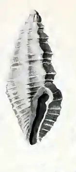 Sculpture:—The first adult whorl shows numerous small radial riblets. On the subsequent whorls the ribs are spaced seven to a whorl. They are continuous, perpendicular, and elevated. The spirals are prominent cords which project at the intersection of the ribs, two on the upper whorls and twelve on the body whorl, evenly distributed from the shoulder to the anterior extremity. The aperture is narrow. The varix is broad and high, of the same calibre as the ribs. The sinus is small and shallow. Within the aperture is a small denticule at each side of the sinus, and a small deeply-seated fold on the columella . The siphonal canal is short and wide.[2]