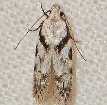 The forewings are pale greyish, dusted with dark grey, and very faintly tinted with roseate. The base of the costal margin, an oblique fascia behind it, and a little farther back, but still before the middle, an oblique costal band, extending to the fold, are all blackish-brown. Behind the last of these streaks, in the middle of the wing, is a short, blackish dash surrounded by a hoary or whitish annulus. Behind the middle is a costal, dark grey spot, opposite to which is a still smaller dorsal one, and opposite to the space between them is another blackish dash, the portions of the wing above and below which are but little dusted, while behind it the apical part of the wing is more densely dusted with brownish scales.[3]
