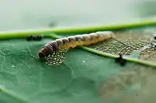 The larvae feed on Quercus species. They skeletonize the leaves of their host plant. The species overwinters in the pupal stage in leaf litter.[4]