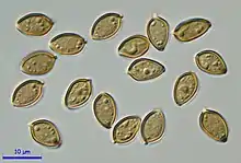 - Microscopic features: Spores (7–) 8–9 (–12) × ( 5.5 – ) 6 – 7 (–8.5) µm, rhomboid to subrhomboid in face view, subellipsoid in side view, thick-walled, with the wall 0.8 to 1.5 µm thick. One end of the spore has a broad germ pore and the other side has a short hilar appendage. Two types of cheilocystidia and pleurocystidia are present. One type of pleurocystidia measures 16 - 24 x 6 - 8 and is venstricose-rostrate. The other type is larger, 20 - 40 micrometers by 12 - 16 micrometers, globose-pyriform, sometimes with a narrow apex and narrow base. The basidia are 4 spored and measure 20 – 28 × 7 – 9 µm.[1]