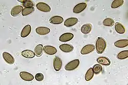 The anamorphic form of P. semilanceata is an asexual stage in the fungus's life cycle involved in the development of mitotic diaspores (conidia). In culture, grown in a petri dish, the fungus forms a white to pale orange cottony or felt-like mat of mycelia. The conidia formed are straight to curved, measuring 2.0–8.0 by 1.1–2.0 μm, and may contain one to several small intracellular droplets.[25] Although little is known of the anamorphic stage of P. semilanceata beyond the confines of laboratory culture, in general, the morphology of the asexual structures may be used as classical characters in phylogenetic analyses to help understand the evolutionary relationships between related groups of fungi.[26]