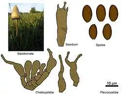 In deposit, the spores are a deep reddish purple-brown color. The use of an optical microscope can reveal further details: the spores are oblong when seen in side view, and oblong to oval in frontal view, with dimensions of 10.5–15 by 6.5–8.5 μm. The basidia (spore bearing cells of the hymenium), are 20–31 by 5–9 μm, four-spored, and have clamps at their bases; there are no basidia found on the sterile gill edge. The cheilocystidia (cystidia on the gill edge) measure 15–30 by 4–7 μm, and are flask-shaped with long thin necks that are 1–3.5 μm wide. P. semilanceata does not have pleurocystidia (cystidia on the gill face). The cap cuticle is up to 90 μm thick, and is made of a tissue layer called an ixocutis—a gelatinized layer of hyphae lying parallel to the cap surface. The hyphae comprising the ixocutis are cylindrical, hyaline, and 1–3.5 μm wide. Immediately under the cap cuticle is the subpellis, made of hyphae that are 4–12 μm wide with yellowish-brown encrusted walls. There are clamp connections present in the hyphae of all tissues.[2]