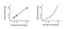 Paul Slovic, a prominent psychologist in the realm of risk, maintains the original interpretation posited by Lifton. Slovic's article, "Psychic Numbing and Mass Atrocity", returns to the collectivist model and most notably confronts the value of saving a human's life. The figures to the right denote both arguments for the hypothesized value of saving a human's life as well as the true value of saving a human's life established through Slovic's empirical research.[1][2] Slovic introduced the concept of psychophysical numbing, which is the diminished sensitivity to the value of life and an inability to appreciate loss.[2] Essentially, the proportion of lives saved is more important than the number of lives saved.[2] One of Slovic's arguments for this outcome is that people suffer from innumeracy and cannot comprehend the emotional connotation associated with large numbers. The threshold, as stated by Slovic, where people cannot comprehend the emotional magnitude of the loss of life is two, as shown in the figure. Paul and researchers say findings can be summarized with "The more who die, the less we care."[2][9]
