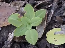 Pterostylis leptochila, commonly known as the Ravensthorpe rufous greenhood[3] or narrow-lipped rustyhood[4] is a plant in the orchid family Orchidaceae and is endemic to the south-west of Western Australia. Both flowering and non-flowering plants have a relatively large rosette of leaves. Flowering plants also have up to five large translucent white flowers with olive green and brown lines and markings and a narrow, insect-like labellum.