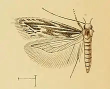 The wingspan is 7.5–9 mm. The forewings are pale fawn brown with whitish cinereous (ash grey) lines and streaks. The hindwings are pale grey.[2]