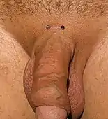 A pubic piercing is a body piercing in the pubic area, on the mons pubis in females, or at the base of the penis in males. Healing times are at around 3–4 months.[1] The rejection rate is around the same as well - that is, higher than most "conventional" (nose, ear, tongue) piercings, because it is a surface piercing. Some get this piercing because it can offer direct stimulation to the clitoris during intercourse. The placement is at the bottom of the pubic mound just above the penile shaft. Usually, the jewelry inserted is a custom-made surface bar, used to give the best chance of healing.