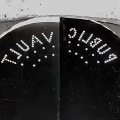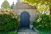A classical marble facade with baroque scrolls decorate the partially subterranean vault. Double wrought iron doors have the words "PUBLIC VAULT" displayed by means of vent holes.[6] The vault is constructed of Aquia Creek sandstone, which was also used to construct many important early structures in Washington, including the White House, the Capitol, and the Latrobe cenotaphs in the cemetery.[7] The vault does not have any niches or shelves to hold coffins, rather the coffins were placed on the floor and stacked if necessary.[8]
