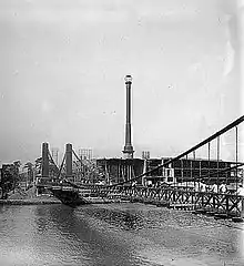 Puente Colgante (which is the term for a suspension bridge in Spanish; literally, hanging bridge), the second bridge built over Pasig river, was the first suspension bridge built in Asia when it was completed in 1852.[1] It was built and owned by Ynchausti y Compañia, the business headed by Jose Joaquín de Ynchausti.[2] He commissioned the wire-cable suspension design from Spanish-Basque engineer Matias Menchacatorre.[3] The bridge was first named Puente de Clavería, likely in honor of the Governor-General of the Philippines Narciso Clavería, who served from 1844 to 1849.