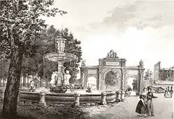 It was added as part of the Walls of Philip IV in 1748, substituting the previous Puerta de Vallecas.[2] The last gate that was finally demolished in the mid-19th century was built by Ventura Rodríguez in 1769 on a program to improve several of the gates of Madrid, which also were built or improved the gates of Puerta de Alcalá and Puerta de Bilbao, the latter two by Sabatini. However, as described the Diccionario geográfico-estadístico de España y Portugal of Tomás López and Sebastián Miñano in 1826, the gate did not deserve "nor by its matter nor by its form, be one of the main of Madrid and was calling for the construction of a more dignified of the place [sic] in which it is located."[1]