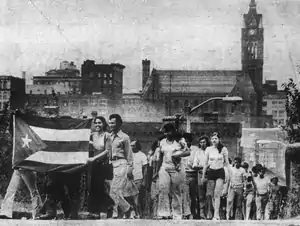 Holyoke's history in Puerto Rican settlements first began around the mid 1950s, when a landlord named Domingo Perez, purportedly became the city's first Puerto Rican resident.[2] By 1956 an article in The Republican reported on 1,000 Puerto Ricans in a self-described immigrant colony in the Greater Springfield area. The first to settle in the area were met with racial discrimination and open hostility, with one Boricua restaurateur describing their people being "treated like animals" at the time. This same family had followed a similar route many others would, having previously moved to the area from New York where they had previously settled in 1948.[21] Another early report of the Puerto Rican community that same year appeared in a Springfield Union article of a wedding held at Holyoke City Hall on January 3, between a Carmen Hermandez and Jesus Mejias, both born in Porto Rico [sic] and residing on Main Street in South Holyoke, who would spend their honeymoon in New York City.[22] At the time Hermandez reportedly worked for the Adams Plastics Co., a South Holyoke-based firm employing 175 workers which future-Mayor Samuel Resnic had cofounded.[23][24] By this time the company, a maker of "pakkawood" composite handles, was sold to EKCO, however Resnic remained with the firm,[25] and would travel to Puerto Rico himself as Mayor in 1963 while vacationing, representing one of Holyoke's earliest informal exchanges with the island.[26]