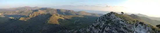 The hill belongs to the Artà mountains, the northern part of the Serres de Llevant mountain range. Its summit reaches an elevation of 386 meters; a saddle at 371 m divides it from a subsummit marked by a trig point at an elevation of 385 m. The municipal boundary between Artà (West of the hill) and Capdepera (East) runs along its crest. Within the municipality of Capdepera, the Puig de Racó is the highest point. At the foot of its western flank runs the road from Artà to Cala Torta from south-west to north-east, while south of the hill runs the provincial road Ma-15 between Artà and Capdepera. Northwest of the Puig des Racó rises the Puig Poca Son, to which it is connected by the Coll des Racó saddle, at 233 m of elevation. Northeast the saddle named Coll de ses Buines (312 m) connects Puig des Racò with the Puig Poloni (363 m).[3] At the southwestern spur of the hill lies the archaeological site of Talaiot de ses Planetes. From the mountain spring some small streams which only occasionally carry water.[4]