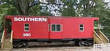 A real Norfolk Southern Railway 380 bay window red caboose with a Southern Railway paint scheme is displayed in the park for children to explore.[8]