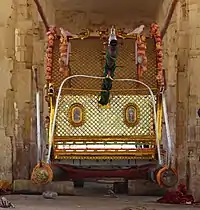 The sapthasthanam festival is conducted at Tiruvaiyaru during April every year. As per Hindu legend, it is the wedding festival of Nandikeswara, the sacred bull of Shiva on the Punarpoosa star during the Tamil month of Panguni.[4] The festival deity of Aiyarappar temple of Thiruvaiyaru is carried in a decorated glass palanquin along with the images of Nandikeswara and Suyasayambikai to the temples in Thirupazhanam, Thiruchottruthurai, Thiruvedhikudi, Thirukandiyur and Thirupoonthurthi. Each of the festival deities of the respective temples mounted in glass palanquins accompany Aiyarppar on the way to the final destiny, Thillaistanam. There is a grand display of fireworks in Cauvery riverbed outside Thillaistanam temple. The seven palanquins are carried to Aiyarappar temple in Thiruvaiyyaru. Hundreds of people witness the convergence of seven glass palanquins carrying principal deities of respective temples from seven places at Tiruvaiyaru. The devotees perform Poochorithal(flower festival) in which a doll offers flowers to the principal deities in the palanquins. After the Poochorithal, the palanquins leave for their respective temples.[5][6]