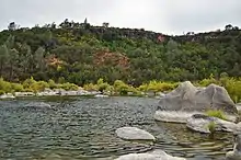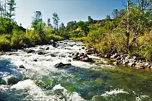Putah Creek (Patwin: Liwaito[3]) is a major stream in Northern California, a tributary of the Yolo Bypass, and ultimately, the Sacramento River. The 85-mile-long (137 km)[2] creek has its headwaters in the Mayacamas Mountains, a part of the Coast Range, and flows east through two dams. First, Monticello Dam forms Lake Berryessa, below which Putah Creek forms the border of Yolo and Solano Counties, and then flows to the Putah Diversion Dam and Lake Solano. After several drought years in the late 1980s, the majority of Putah Creek went dry, prompting a landmark lawsuit that resulted in the signing of the Putah Creek Accord in 2000. The Accord established releases from the dams to maintain stream flows in Putah Creek, with natural flow regimes which spike in winter/spring and ebb in summer/fall. The restoration of natural flow regimes has resulted in a doubling of riparian bird species and a return of spawning native steelhead trout and Chinook salmon, as well as protecting the livelihood of farmers on the lower watershed.[4][5]