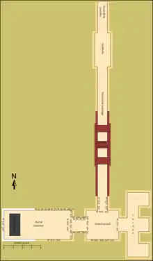 The entrance into the substructure of the pyramid lay under the chapel's pavement.[27][36] The substructure of the pyramid is similar to that of Unas's predecessor, Djedkare Isesi.[27] The entry leads into a 14.35 m (47.1 ft) long vertically sloping corridor inclined at 22° that leads to a vestibule at its bottom.[49][22] The vestibule is 2.47 m (8.1 ft) long and 2.08 m (6.8 ft) wide.[49] From the vestibule, a 14.10 m (46.3 ft) long horizontal passage follows a level path to the antechamber and is guarded by three granite slab portcullises in succession.[22][36][49] The passage ends at an antechamber, a room measuring 3.75 m (12.3 ft) by 3.08 m (10.1 ft), located under the centre axis of the pyramid. To the east, a doorway leads to a room – called the serdab[50] – with three recesses.[36][lower-alpha 2] The serdab measures 6.75 m (22.1 ft) wide and 2 m (6.6 ft) deep.[49] To the west lay the burial chamber, a room measuring 7.3 m (24 ft) by 3.08 m (10.1 ft), containing the ruler's sarcophagus.[27][53] The roof of both the antechamber and burial chamber were gabled, in a similar fashion to earlier pyramids of the era.[27]