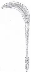 It was used to deflect the enemy’s arrows and spears. It has a leaf-shaped head without an ergot, which distinguishes it from the roromaraugi.[1][2] The head is separated in two by a central ridge and the handle is often finished by an anthropomorphic sculpture.[3] It is more common than the roromaraugi and was used for war.[4]