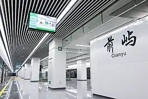Qianyu Station (Chinese: 前屿站; pinyin: Qiányǔ zhàn; Fuzhounese: Sèng-sê̤ṳ) is a transfer station of Line 2 and Line 4 of the Fuzhou Metro. It is located near the intersection of Fuma Road and Lianjiang Road, Jin'an District, Fuzhou, Fujian, China. It started operation on April 26, 2019.[1]