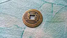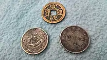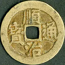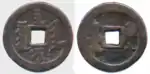 During the Qing dynasty period, the Chinese monetary system was a bimetallic system where both copper-alloy cash coins and silver circulated simultaneously.[15] The copper-alloy currency during most of the Qing dynasty period consisted solely of cash coins with a denomination of 1 wén, which could be strung together into strings of 1,000 cash coins for larger payments.[15] While strings officially consisted of 1,000 cash coins, normally it would contain only around 980 copper-alloy cash coins.[33][15]