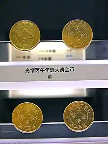 In 1906 the General Mint of the Ministry of the Interior and Finance in Tianjin started issuing a new copper coin called the Dà Qīng Tóng Bì (大清銅幣), which like Guāng Xù Yuán Bǎo coins featured the image of a Chinese dragon, and had English, Chinese, and Manchu inscriptions with the English inscription reading "Tai-Ching-Ti-Kuo Copper Coin" in Wade-Giles, coins minted under the Guangxu Emperor featured the inscription of the Chinese characters Guāng Xù Nián Zào (光緒年造).[14] These coins were minted in denominations of 2 wén, 5 wén, 10 wén, and 20 wén and would soon be issued by various mints across the Chinese provinces.[14] These coins were first issued by the Ministry of the Interior and later by the Ministry of Revenue and Expenditure.[14]