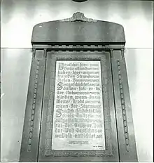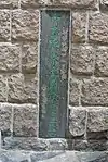 The office building is located on the top of the east side of the observatory. The platform of the building is 77.76 metres above sea level.[7] The 21.6-metre-high building has a 3-floor main body and 7-floor tower.[15] The outer walls are all made of granite stone and the roof slopes with beef-tongue-like tiles. The parapet wall at the top of the tower is constructed into a castellated shape. The entire building is shaped like a medieval European castle.[15][16] According to German naval literature, the Observatory building is designed with the following: offices, laboratories, libraries, public reading rooms, a temperature-controlled basement with clocks, temperature coefficient-measuring rooms equipped with a dual heating system, metalwork workshops and other auxiliary rooms.[17][18] The ground floor of the building lays a fuchsia glazed tile floor connected by stone steps. There is still a white marble stone monuments intact on the corridor wall, engraved with a German poem[16][7] by German poet Ernst von Wildenbruch.|Ernst von Wildenbruch}}