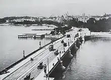 Due to rapidly increasing maintenance costs, the original construction had to be replaced in 1984,[12] and a new bridge was built parallel to the old bridge between 1983 and 1984, on steel girders. The weekend of March 16/17, 1984,[13] traffic was blocked and the old construction was moved on steel beams and columns in the lake which took 15 hours in total to move the old construction and replace it with a concrete slab.[5][14] The construction costs totaled to 18 million CHF, and the width of the bridge measured from then on 30.5 meters.[12] Initiatives to redesign the old bridge as a pedestrian zone were rejected.[15]