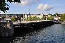 Quaibrücke (English: Quay Bridge) is a road, tramway, pedestrian and bicycle bridge over the river Limmat, at the outflow of Lake Zürich in the city of Zürich, Switzerland. It was built simultaneously with the construction of Zürich's new quays between 1881 and 1887.[2]