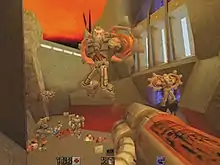 The PlayStation version uses a new engine developed by HammerHead for their future PlayStation projects[16] and runs at a 512x240 resolution at 30 frames per second.[15] The developer was keen to retain a visual parity with the PC version and avoid tricks such as the use of environmental fog. Colored lights for levels and enemies, and yellow highlights for gunfire and explosions, are carried across from the PC version, with the addition of lens flare effects located around the light sources on the original lightmaps. There is no skybox; instead, a flat Gouraud-textured purple "sky" is drawn across the ceiling. The game uses particles to render blood, debris, and rail gun beams analogously to the PC version.
