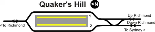 Quakers Hill station opened in 1872 as Douglas Siding. It was renamed Quakers Hill on 30 March 1905 and relocated to its present location on 29 June 1939.[2] Two sets of points at the southern end of the station allow trains to terminate on either platform.