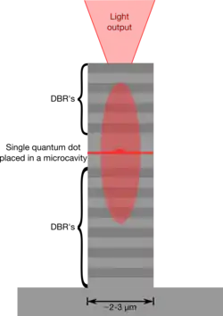 - Micropillars: In this approach, quantum dots are grown between two distributed bragg reflectors (DBR mirrors). The DBRs are typically both grown by molecular beam epitaxy (MBE). For the mirrors two materials with different indices of refraction are grown in alternate order. Their lattice parameters should match to prevent strain. A possible combination is a combination of aluminum arsenide and gallium arsenide-layers.[10][13] After the first DBR, material with smaller band gap is used to grow the quantum dot above the first DBR. The second layer of DBRs can now be grown on top of the layer with the quantum dots. The diameter of the pillar is only a few microns wide. To prevent the optical mode from exiting the cavity the micropillar must act as a waveguide. Semiconductors usually have relatively high indices of refraction about n≅3.[14] Therefore, their extraction cone is small. On a smooth surface the micropillar works as an almost perfect waveguide. However losses increase with roughness of the walls and decreasing diameter of the micropillar.[15] The edges thus must be as smooth as possible to minimize losses. This can be achieved by structuring the sample with Electron beam lithography and processing the pillars with reactive ion etching.[9]