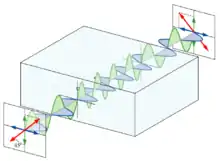 A waveplate or retarder is an optical device that alters the polarization state of a light wave travelling through it. Two common types of waveplates are the half-wave plate, which shifts the polarization direction of linearly polarized light, and the quarter-wave plate, which converts linearly polarized light into circularly polarized light and vice versa.[1] A quarter-wave plate can be used to produce elliptical polarization as well.
