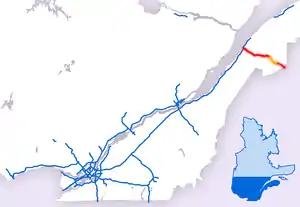 Autoroute 85 is a Quebec Autoroute and the route of the Trans-Canada Highway in the province's Bas-Saint-Laurent region, also known as the Autoroute Claude-Béchard. It is currently under construction with committed Federal and Provincial funding for its completion, with an estimated completion date of 2025.[3] Once this upgrade is completed, it will close the last gap in the nearly continuous freeway section of the Trans-Canada between Arnprior, Ontario, and Sutherlands River, Nova Scotia, and for an even longer interprovincial freeway route between Windsor, Ontario and Halifax, Nova Scotia. Running between Rivière-du-Loup (at a junction with Autoroute 20) and a junction with New Brunswick Route 2 at the Quebec-New Brunswick border, the A-85 when complete will be the only controlled access highway link between the Maritime Provinces and the rest of the country. The A-85 is projected to be approximately 100 km (60 mi) long when construction is complete and is intended to replace Route 185, which has been called one of the deadliest highways in Canada.[4]