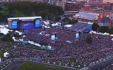 Festival d'été de Québec (FEQ) is the biggest outdoor musical event in Quebec City, Quebec, Canada. The event was held since 1968, the 11-day festival takes place every year in July. FEQ's eclectic programming includes the biggest international stars and emerging artists from around the globe. Its main stage is the biggest self-supporting stage in North America. The biggest crowd in the history of the FEQ is the Rolling Stones in 2015 with 103,000 at The Bell Stage (Plains of Abraham stage).