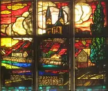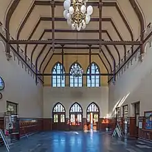 The interior of the Gothic Revival entrance building has stained glass windows, which were redesigned in 1906. These were produced by the Ferdinand Müller stained glass factory and represent views of the castle hill (Schlossberg) and the town hall (Rathaus).[16] The station has been entered in the list of Quedlinburg cultural monuments.