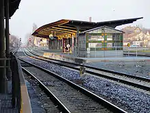 Even before the suspension of traffic on the line to Frose, there were plans to extend the narrow-gauge Selke Valley Railway (Selketalbahn) from Gernrode to Quedlinburg to increase its attractiveness. Originally, the connection was to have been made by installing dual gauge track. After the closure of the standard-gauge line, these plans were abandoned and the Gernrode–Quedlinburg section was regauged.[25] Due to the well-preserved embankment, the construction time was just under a year, with almost all level crossings modernised or replaced by automatic systems. Platform 3 has since then been used as the terminus of the Selke Valley Railway, which has a siding next to a bypass track to handle steam locomotives. In addition, a new water crane was installed at the end of the platform. There are several train journeys daily from Quedlinburg via Gernrode to Eisfelder Talmühle, two of them steam-hauled. Several special excursions have run directly to Brocken. Passenger traffic on the Selke Valley Railway has increased by 20% as a result of the extension to Quedlinburg.[8]