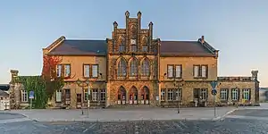 Quedlinburg station is a station on the Magdeburg–Thale railway in Quedlinburg in the German state of Saxony-Anhalt. It was built in 1862 as a through station on the southern edge of the town. The Gothic Revival entrance building of 1862, together with the other parts of the nearly complete Gründerzeit ensemble, is heritage-protected.