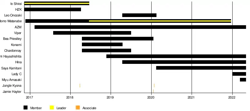 Watanabe, HZK and Shirai won their first titles, the Artist of Stardom Championship on the second night of Stardom New Years Stars 2017 from January 7 by defeating Oedo Tai's Kagetsu, Viper and Kyoko Kimura who replaced Hana Kimura in the title defense.[8] AZM joined the stable on February 11, 2017, and after seven days she teamed up with Momo Watanabe and HZK to win the vacant Artist of Stardom Championship on the second night of the Stardom Grows Up Stars event by defeating Oedo Tai (Hana Kimura, Kagetsu and Rosa Negra) in the finals of a four-team tournament.[9] Another combination of members under which the stable operated was portraited by HZK, Io Shirai and Piper Niven who teamed up at the Stardom Midsummer Champions event from August 13, 2017, defeating Team Jungle (Hiroyo Matsumoto, Jungle Kyona and Kaori Yoneyama) for the Artist of Stardom Championship.[10] At the 2017 edition of the Goddesses of Stardom League which took place between October 4 and November 5, HZK and Io Shirai represented the stable, placing themselves in the A Block and scoring a total of five points after going against the teams of Jungle Kyona and Yoko Bito, Chardonnay and Scarlett, Oedo Tai (Hana Kimura and Kagetsu) and AZM who teamed up with Starlight Kid with the latter not being recognized as part of the faction.[11]