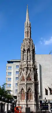 The Queen Eleanor Memorial Cross is a memorial to Eleanor of Castile erected in the forecourt of Charing Cross railway station, London, in 1864–1865. It is a fanciful reconstruction of the medieval Eleanor cross at Charing, one of twelve memorial crosses erected by Edward I of England in memory of his first wife. The Victorian monument was designed by Edward Middleton Barry, also the architect of the railway station, and includes multiple statues of Queen Eleanor by the sculptor Thomas Earp. It does not occupy the original site of the Charing Cross (destroyed in 1647), which is now occupied by Hubert Le Sueur's equestrian statue of Charles I.