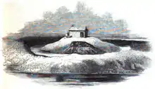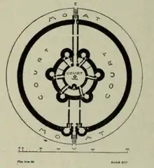 The circular rotunda enclosed a central paved courtyard with a "great well" in the middle. The exterior wall of the rotunda had six circular towers regularly spaced, apart from the two which protected the main, eastern entrance.[12] The Commissioners reported that the rotunda contained twelve rooms "downstairs" and "about forty rooms from the first story upwards".[14] About 30 yards (27 metres) out from the rotunda was a plain circular curtain wall enclosing a bailey our outer court. The curtain had only two towers which formed a gatehouse for the main entrance at the western side, meaning that any attackers who forced this gate would have had to make their way around to the other side of the bailey to find the rotunda entrance. The curtain wall was surrounded by a large circular moat.[12] Opposite the rotunda entrance was a postern, a small secondary gate for pedestrians. The postern and the main gate were linked to the rotunda by walled passages which divided the bailey. It is known from the castle records that two stone buildings were built in the bailey from 1369 to 1377, although their form and function are unknown.[5] Records also suggest that the castle had a fish pond and a garden.[12] The whole building was estimated by the Commissioners to "upwards of three acres of land".[14]