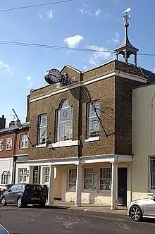 The market house was demolished and replaced by a new guildhall in 1728: this building was deemed by civic officials to project out too far into the High Street and they decided to demolish it in the late 18th century. The current building was designed in the neoclassical style, built in yellow brick and was completed in 1793.[4] The design involved a symmetrical main frontage with three bays facing onto the High Street; the ground floor was arcaded with four Tuscan order columns supporting the floor above. The central bay, which slightly projected forward, contained a Venetian window on the first floor and a parapet and a small pediment above. The outer bays were fenestrated with casement windows on the first floor. There was a projecting clock on the front of the building and, at roof level, there was a cupola with a weather vane.[1] Internally, the principal rooms were the courtroom on the first floor and the dungeon, which contained two cells, each of about 12 square feet (1.1 m2),[5] in the basement.[6]